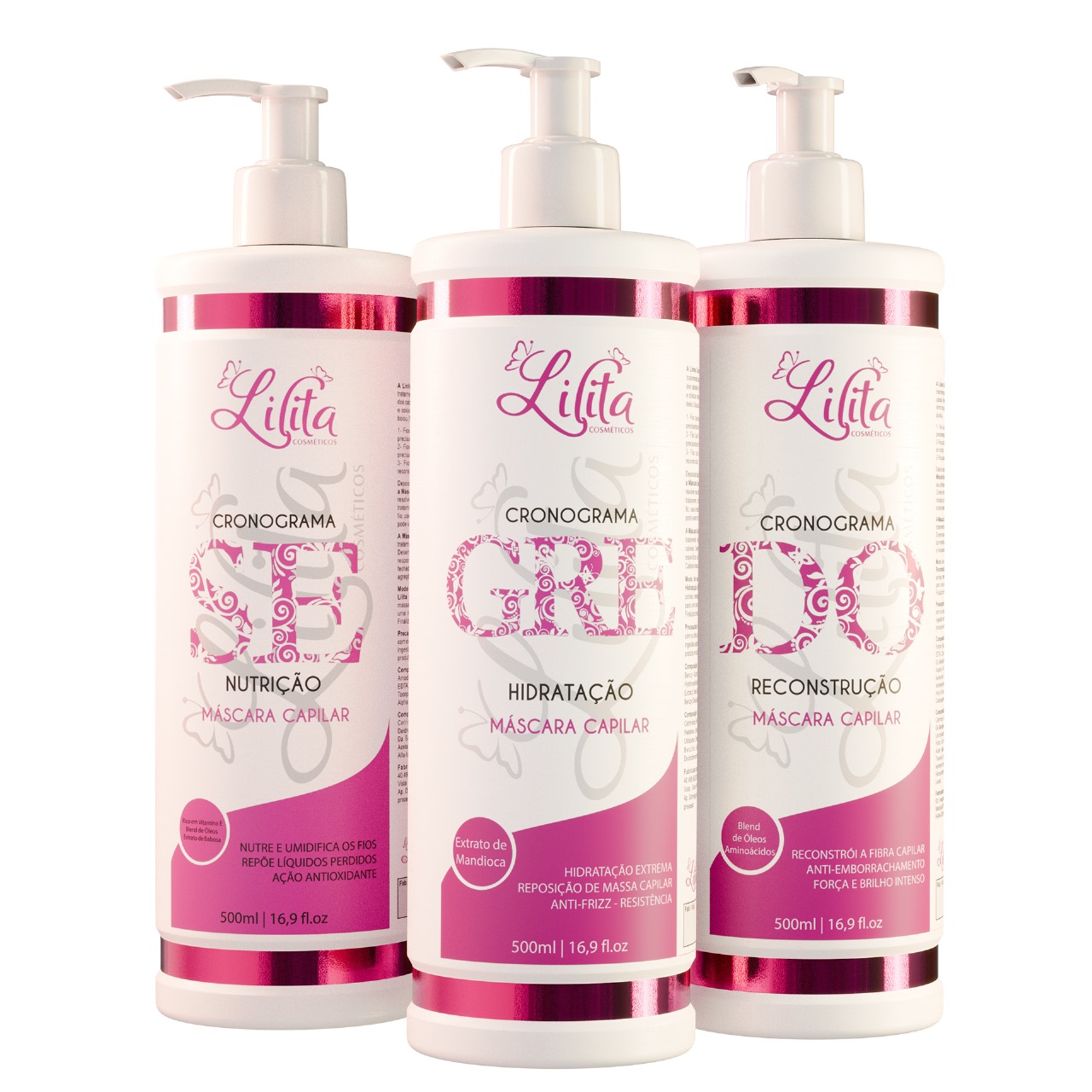 Kit Cronograma Capilar Segredo Nutrição Hidratação Reconstrução Lilita Cosmeticos de 500 gr cada ideal para todos os tipos de cabelos